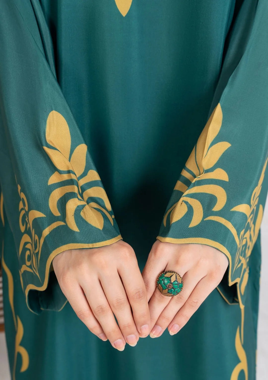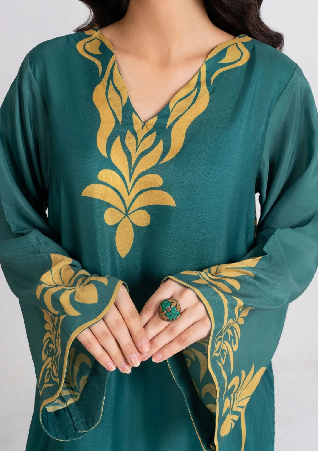 Make a graceful statement in this emerald green long shirt adorned with striking golden motifs. Designed with a relaxed, flowy cut and wide sleeves, it offers both elegance and comfort. The scalloped hem and intricate detailing add a touch of sophistication, making it perfect for festive occasions, formal gatherings, or evening wear.