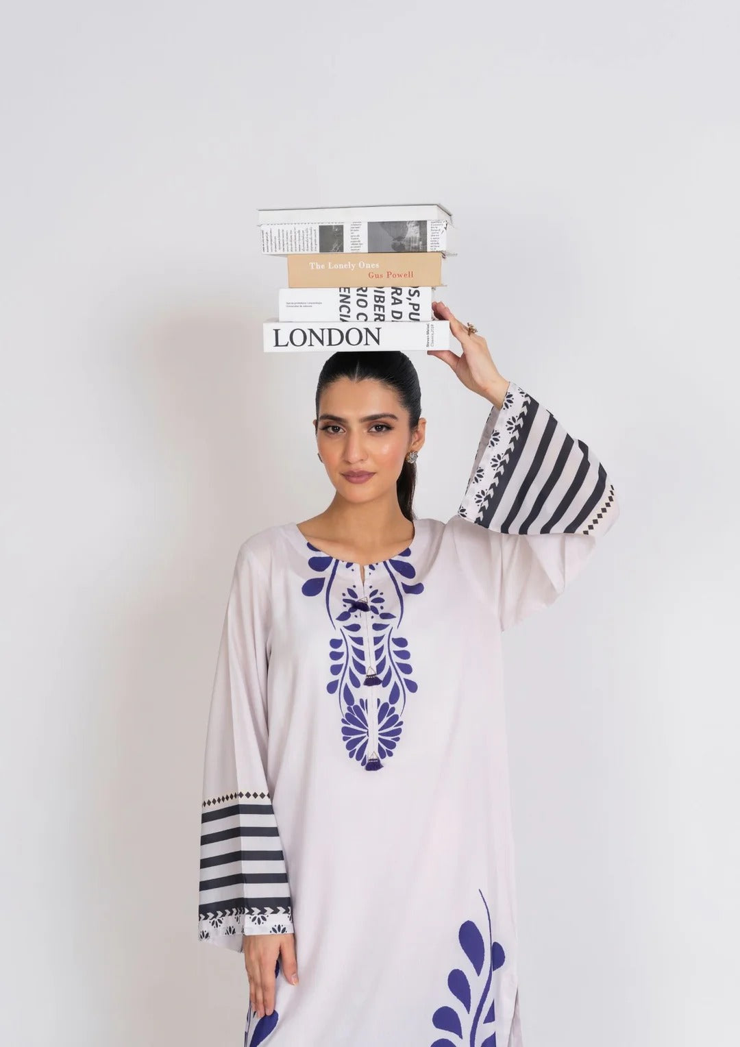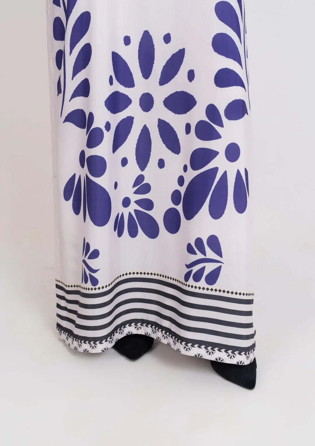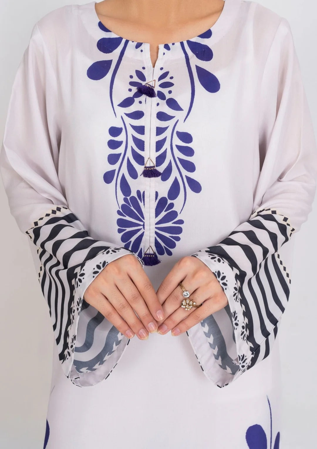 Elevate your style with this ivory Swiss Silk long shirt, beautifully adorned with bold navy floral motifs. The neckline features delicate tassel detailing, while the wide striped sleeves add a contemporary twist to its classic elegance.