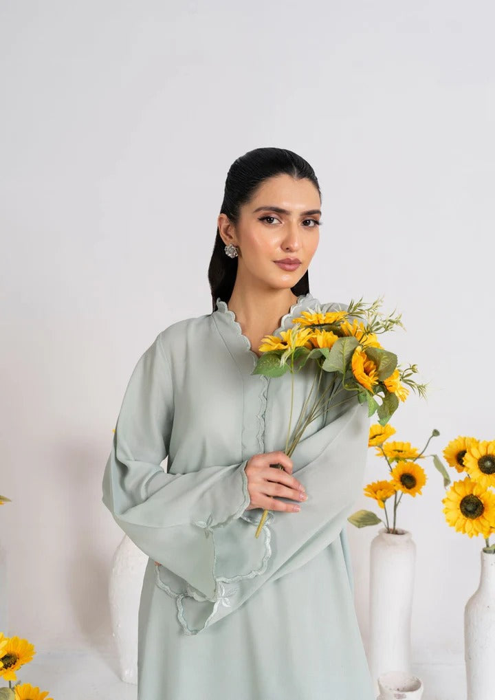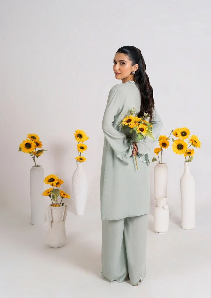 Elevate your everyday style with this soft mint green 2-piece set, crafted from lightweight georgette for a breezy and graceful look. The kurta features a delicately scalloped neckline and sleeves, adorned with subtle thread embroidery that adds a touch of refinement. Paired with wide-leg trousers finished with scalloped embroidered hems, this ensemble strikes the perfect balance of simplicity and elegance.