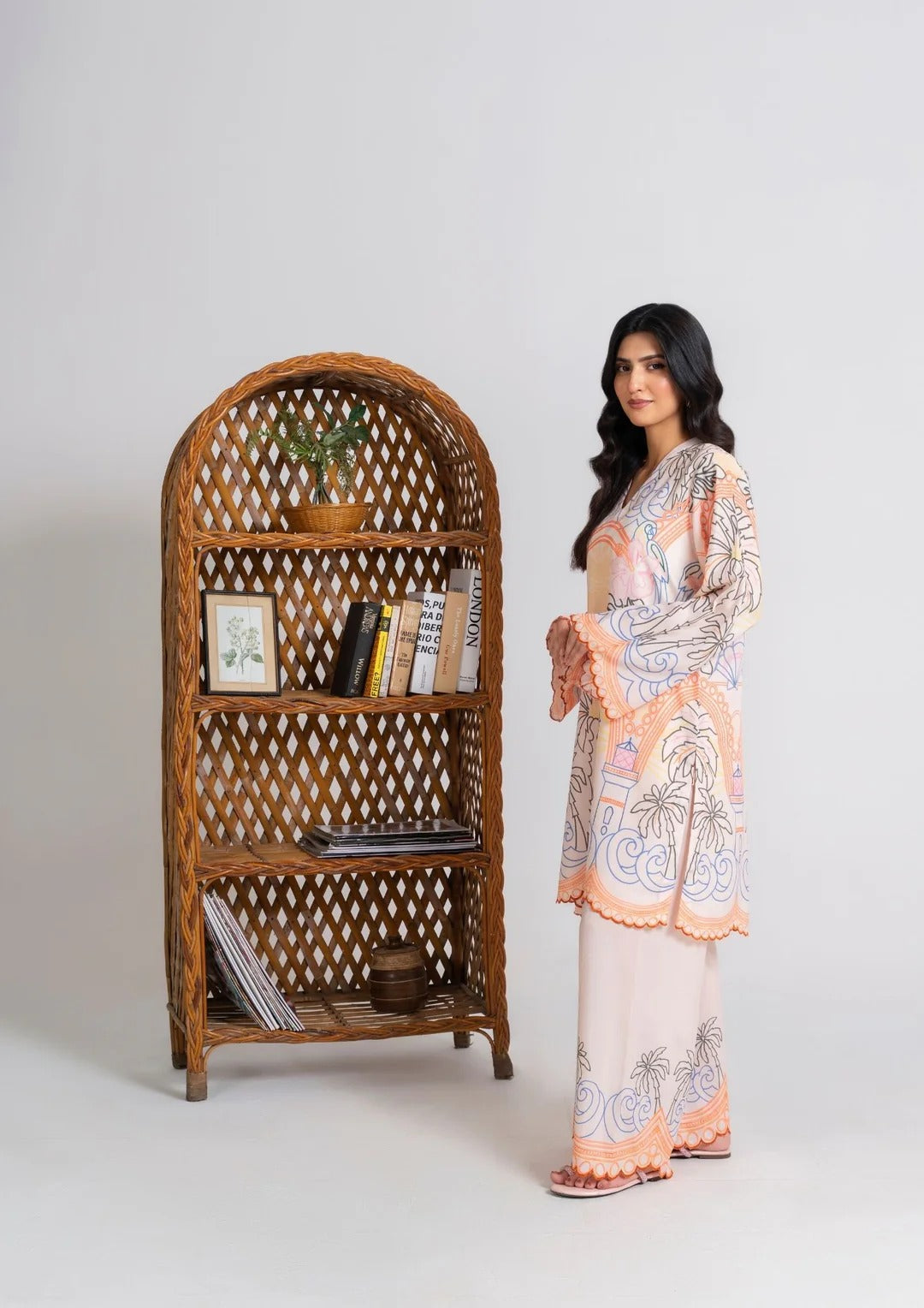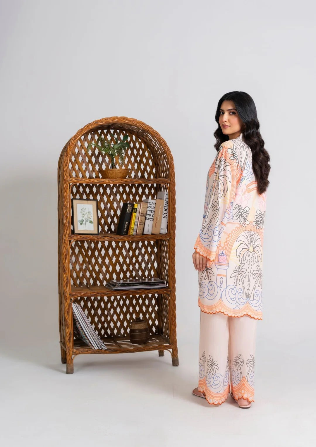 Bask in tropical charm with this 2-piece Swiss Silk suit, featuring a pastel peach base highlighted with scenic palm, wave, and lighthouse-inspired prints. The shirt is designed with a scalloped hemline and wide sleeves, finished with delicate embroidered edging for a graceful flow. Paired with wide-leg trousers carrying coordinated motifs, this outfit radiates effortless sophistication.