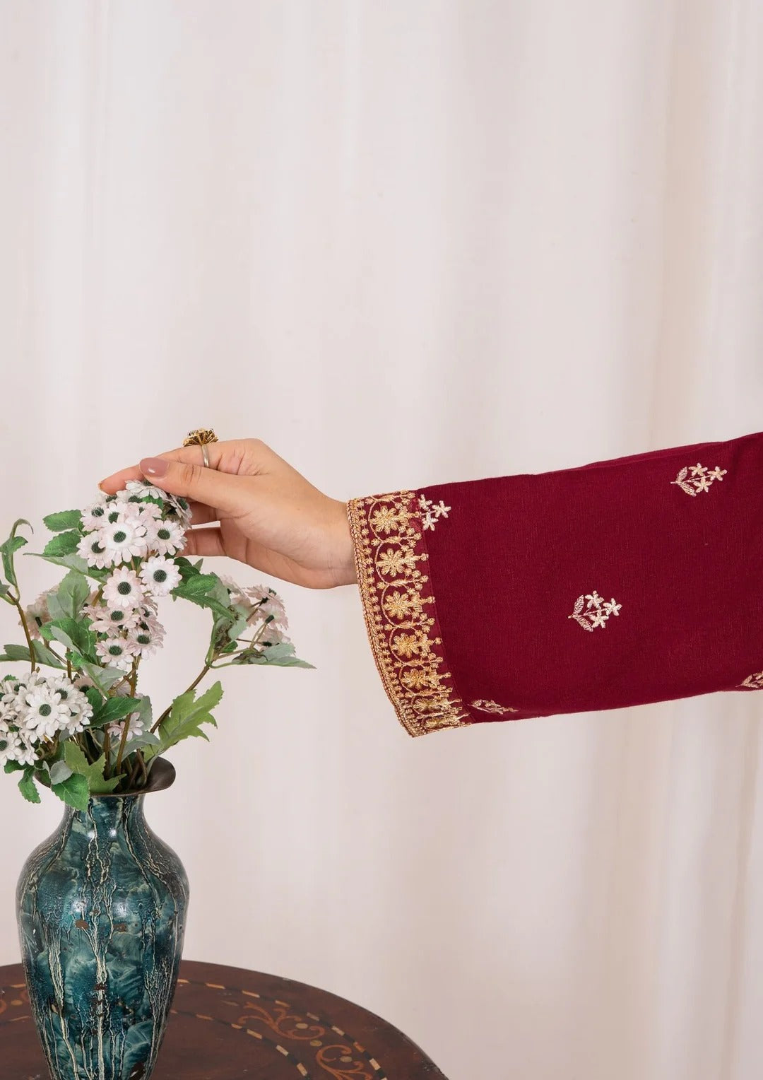 Crafted from premium Silk Karandi fabric, this outfit offers a smooth drape, cozy warmth, and a luxurious feel—making it ideal for festive gatherings, formal dinners, and winter occasions.